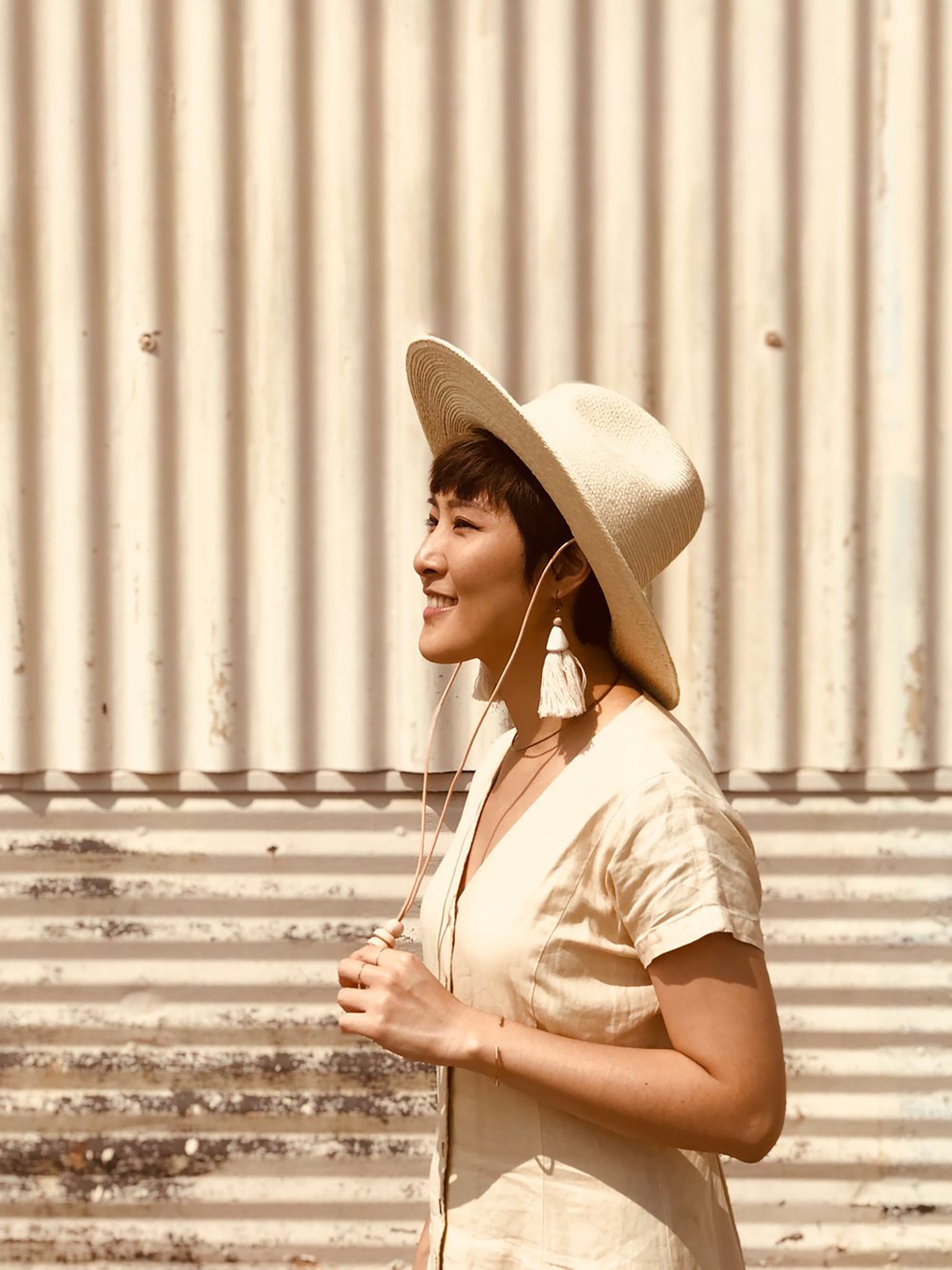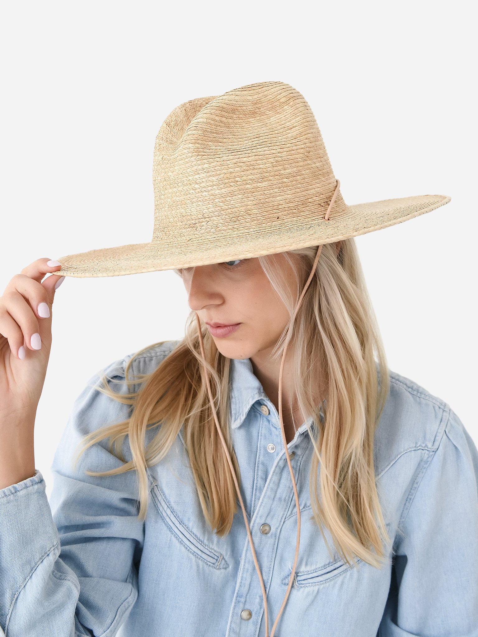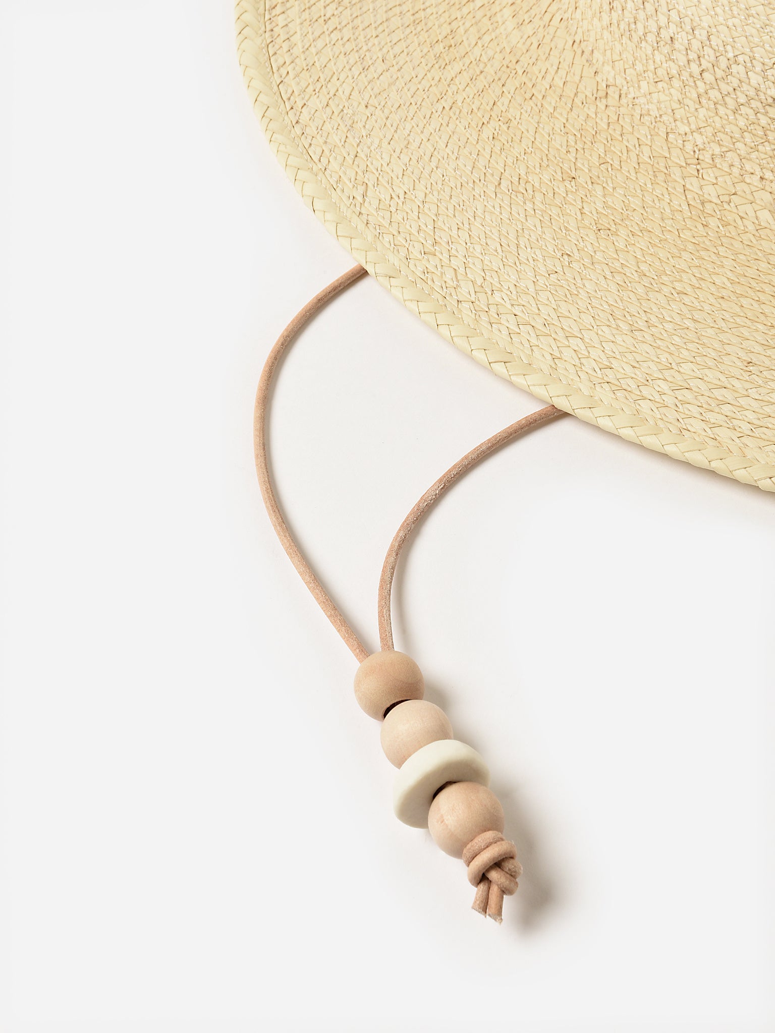 Handmade palm hat with a leather cord, natural clay details, and a flat brim.