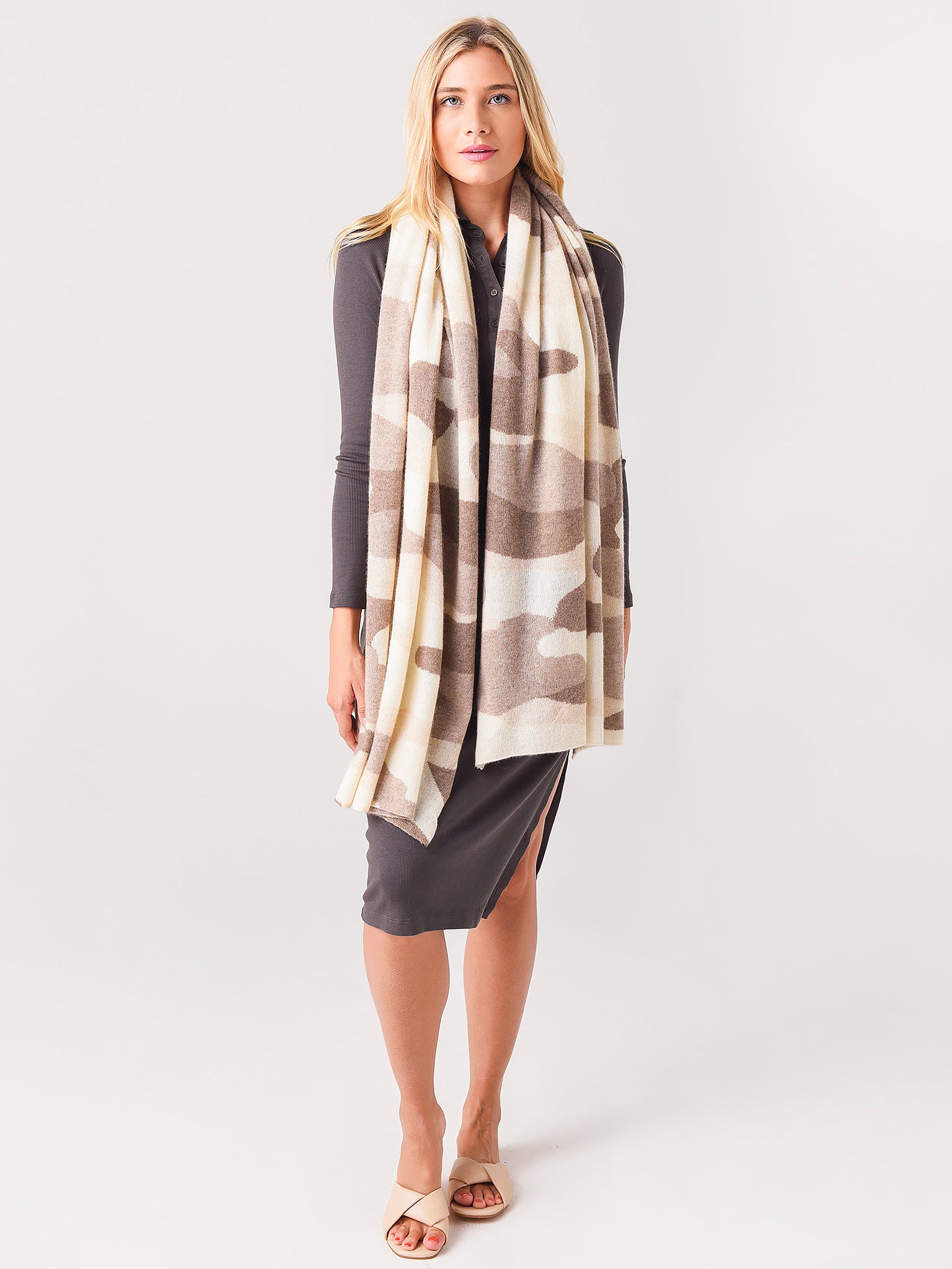 Throw on a bold yet subtle feat to your outfit with the oh so comfortable White + Warren Women's Cashmere Camo Intarsia Mini Travel Wrap.