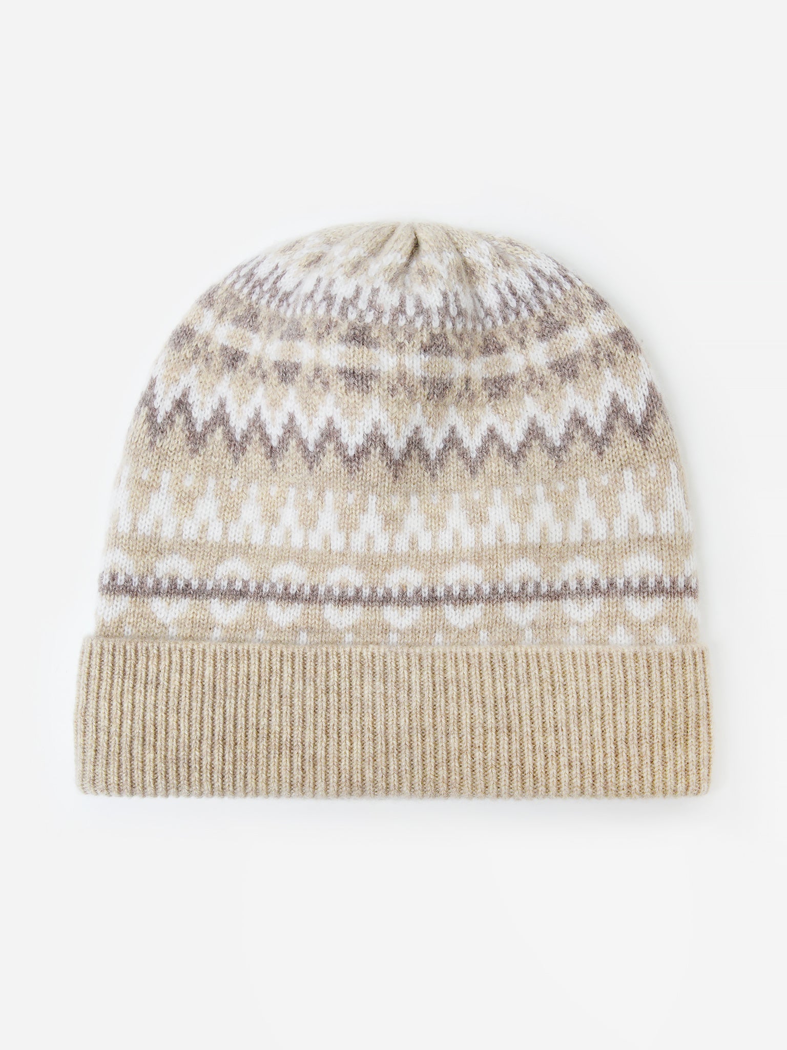 Soft cashmere beanie with a fair isle print.