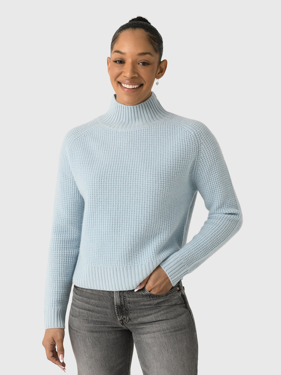 Crafted from pure cashmere, this standneck sweater offers warmth without weight. It features a unique waffle-stitch texture, relaxed raglan sleeves, and a comfortable straight fit.