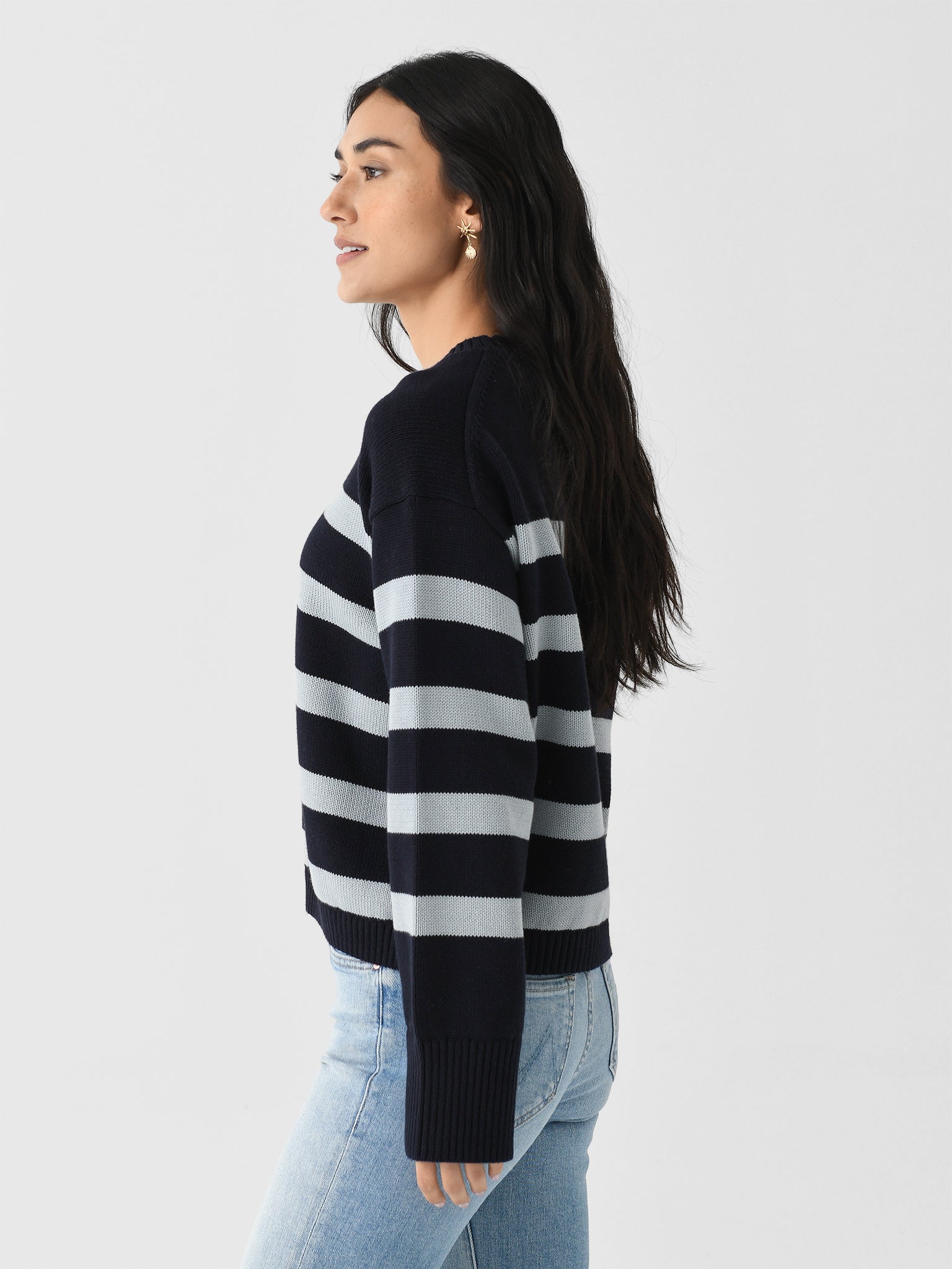 This classic crewneck sweater is made from soft organic cotton and features a two-tone stripe design.