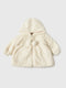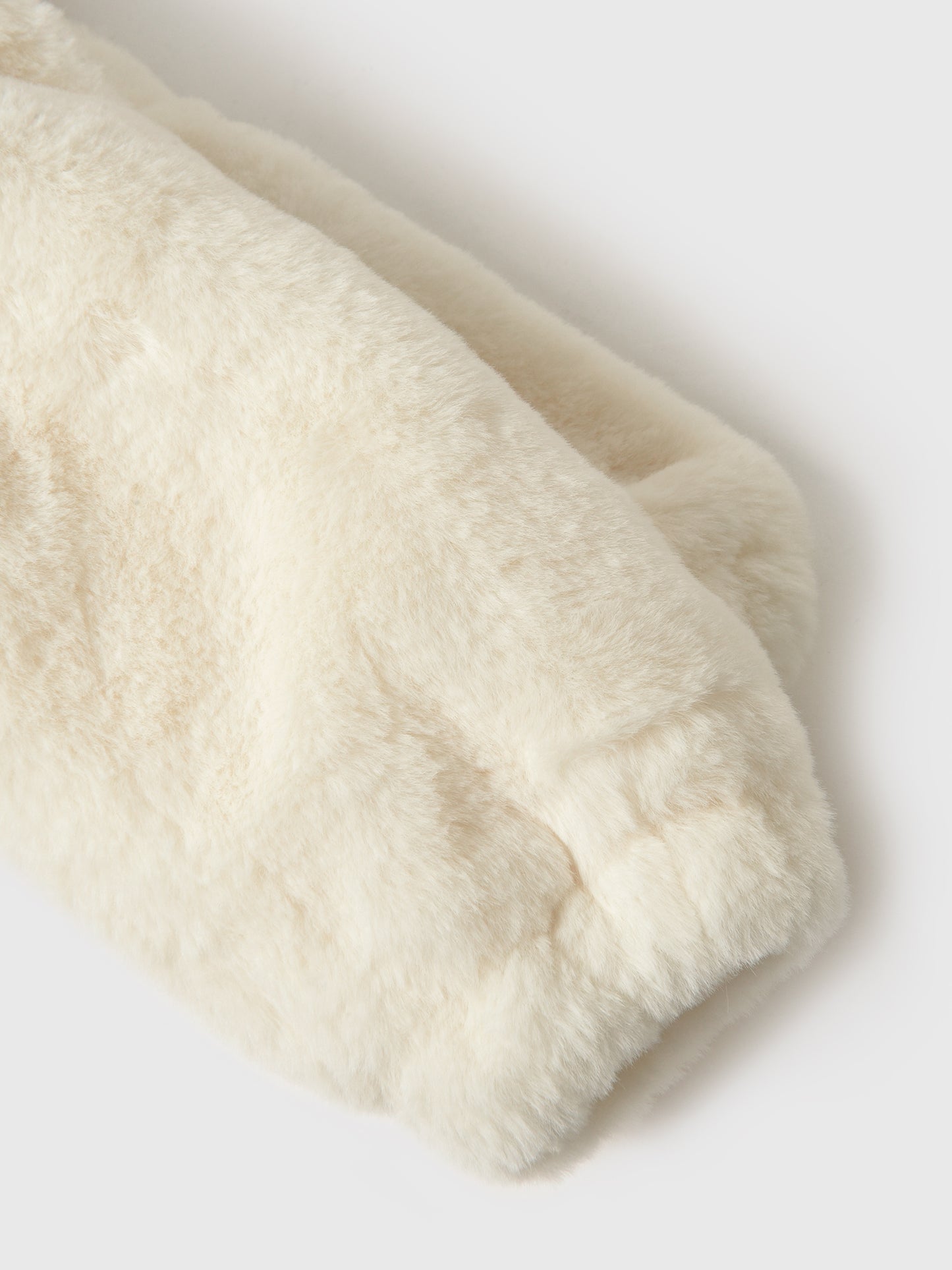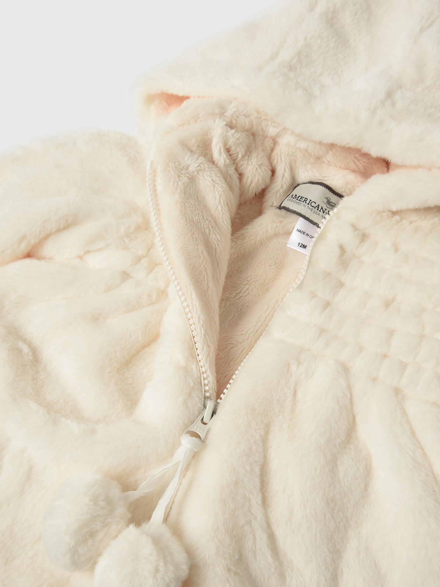 A cozy faux fur jacket with a large hood, smocked detailing, and a pom-pom zipper pull.