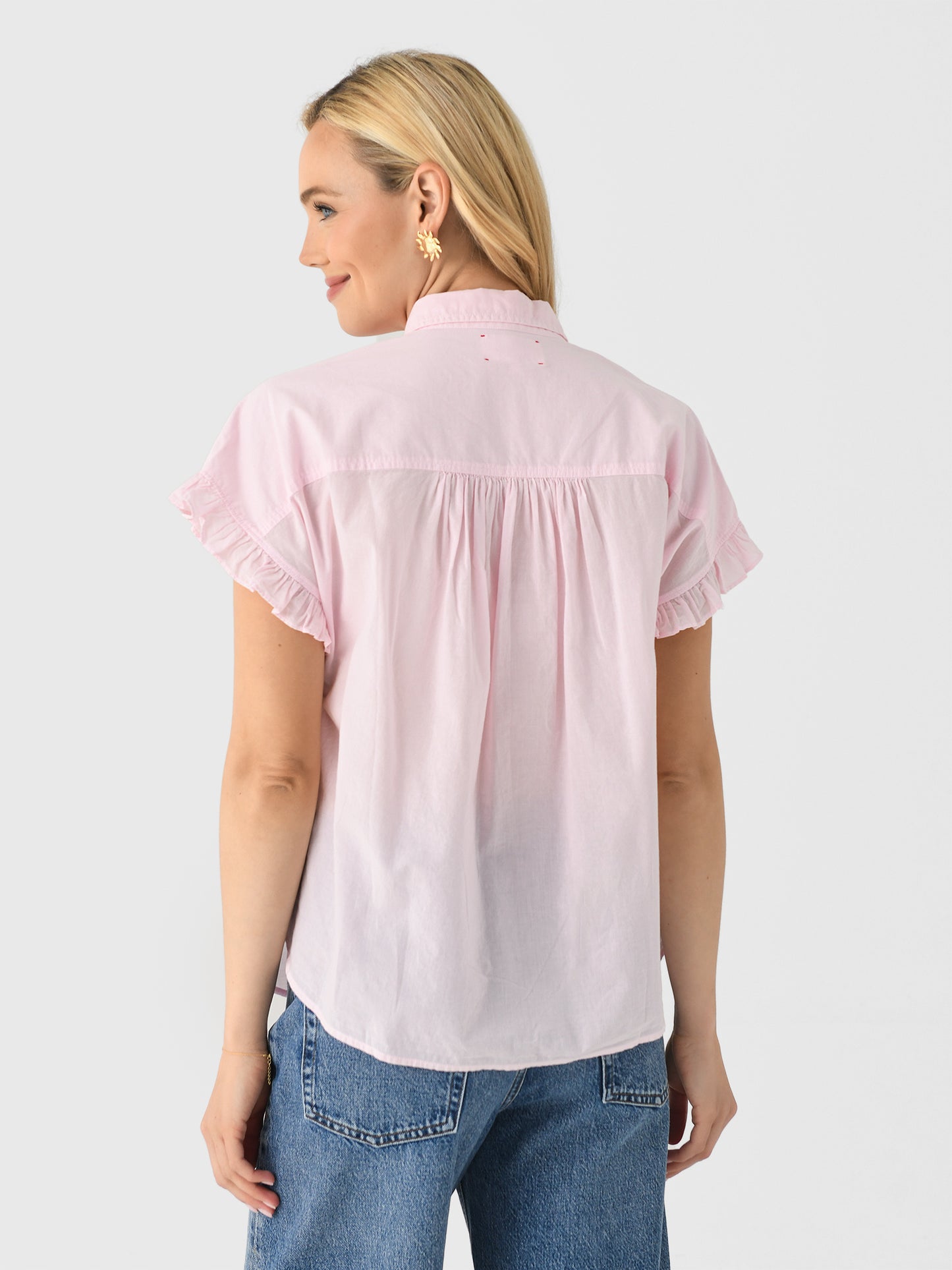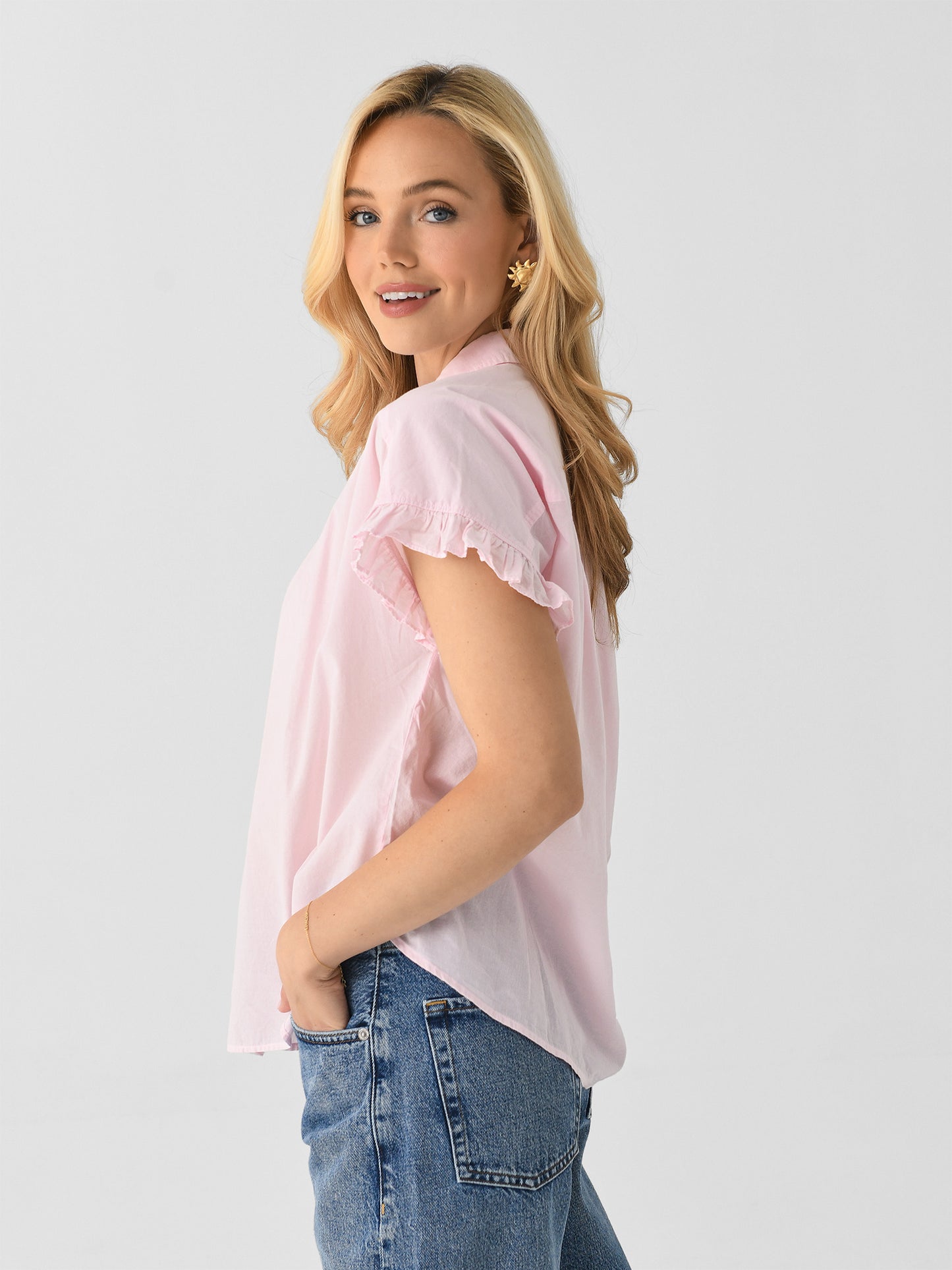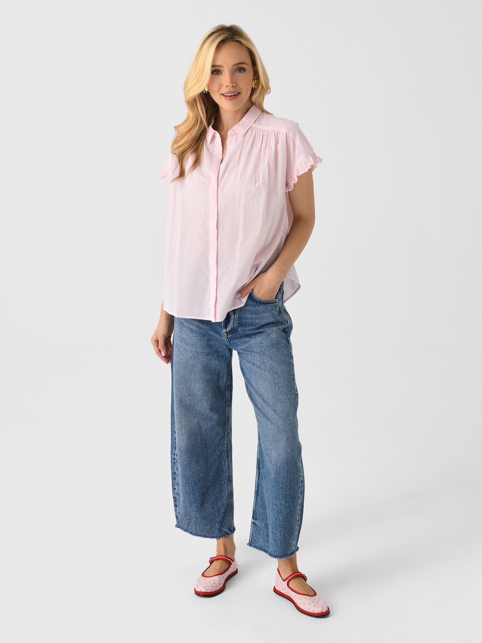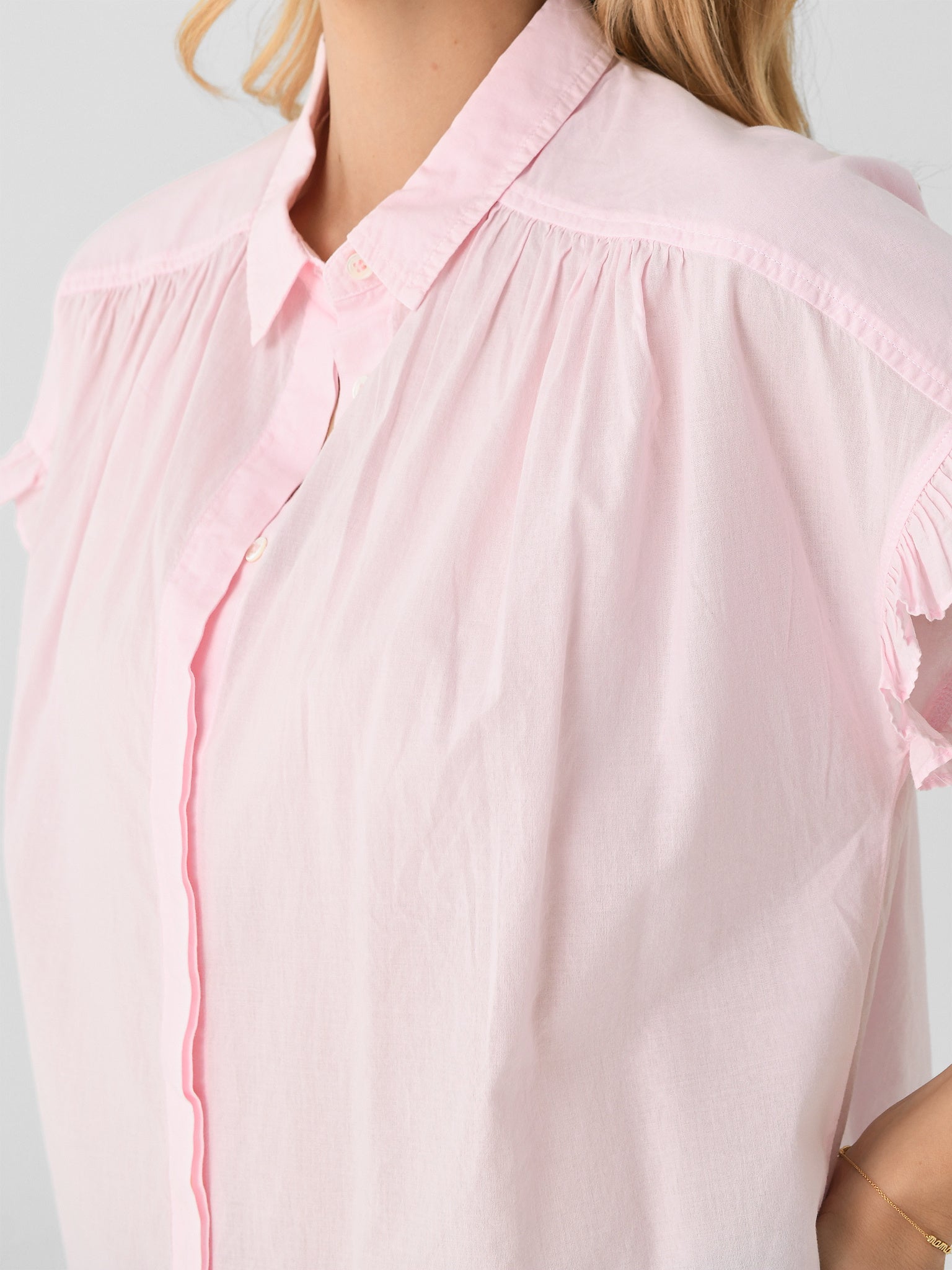 A lightweight woven shirt made from crisp cotton and finished with ruffle-trimmed sleeves and a hidden placket.