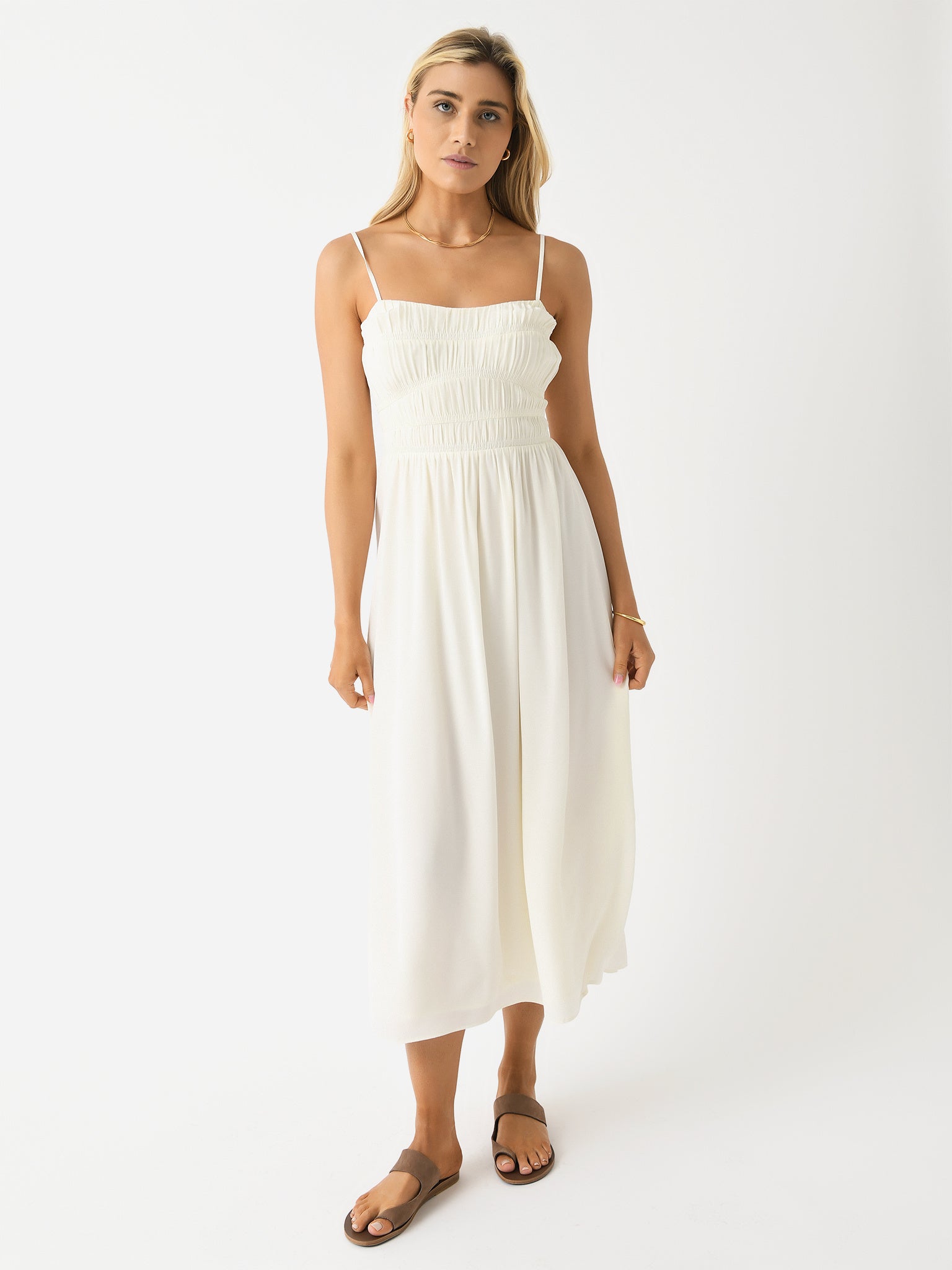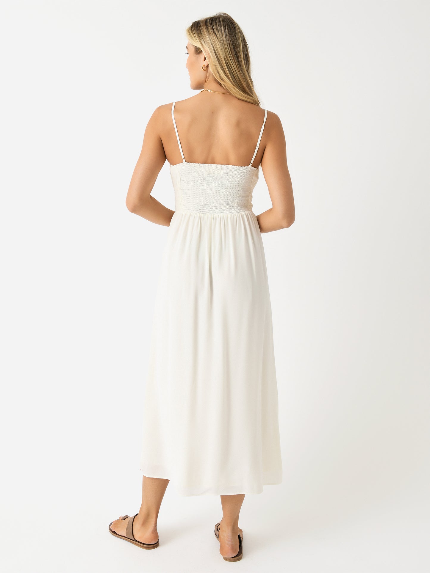 A silky smooth dress with a decorative stitched bodice and a flowy, mid-length skirt.