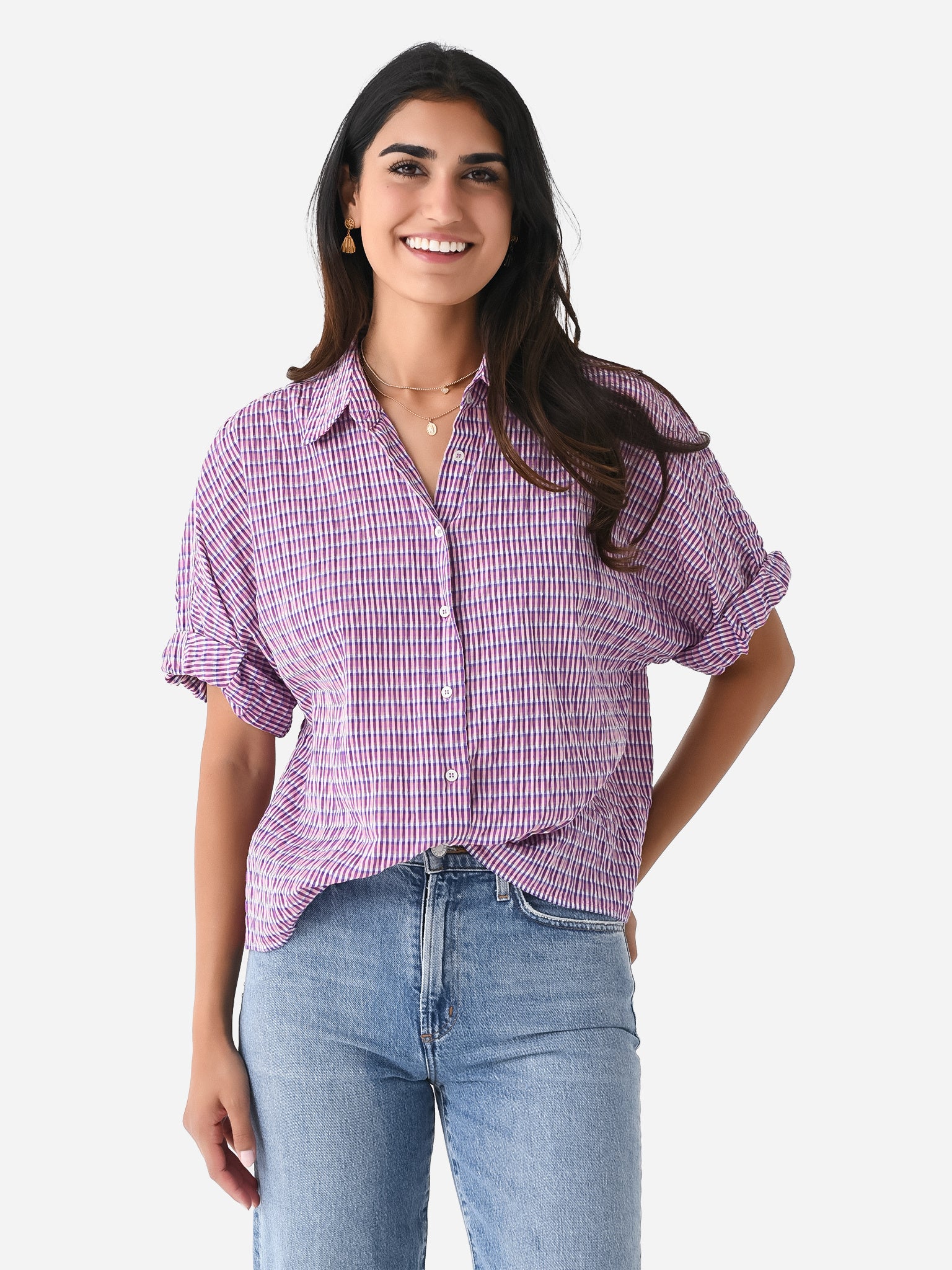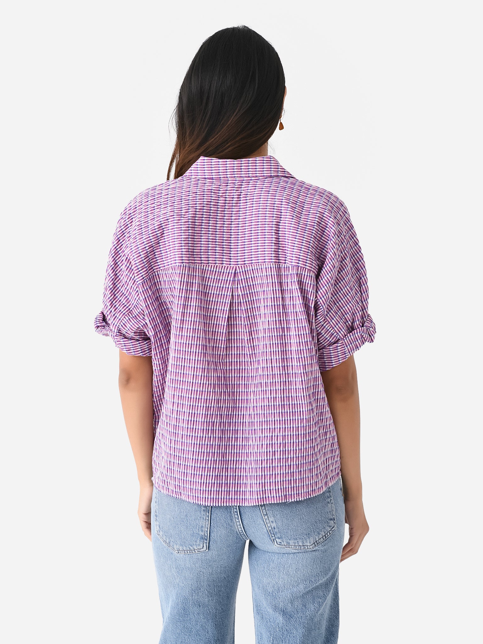 Short sleeve button-down shirt with rolled cuffs and a crinkle finish.