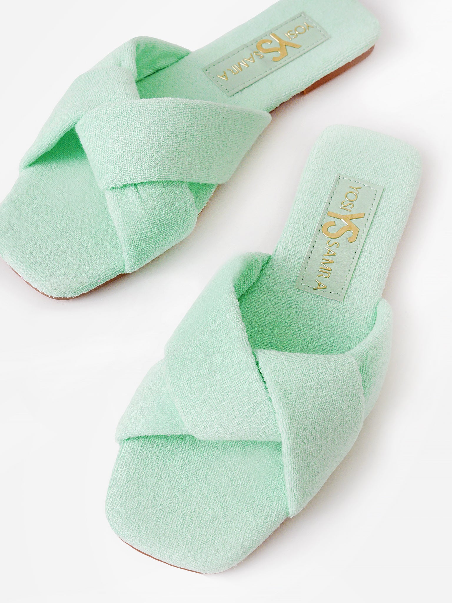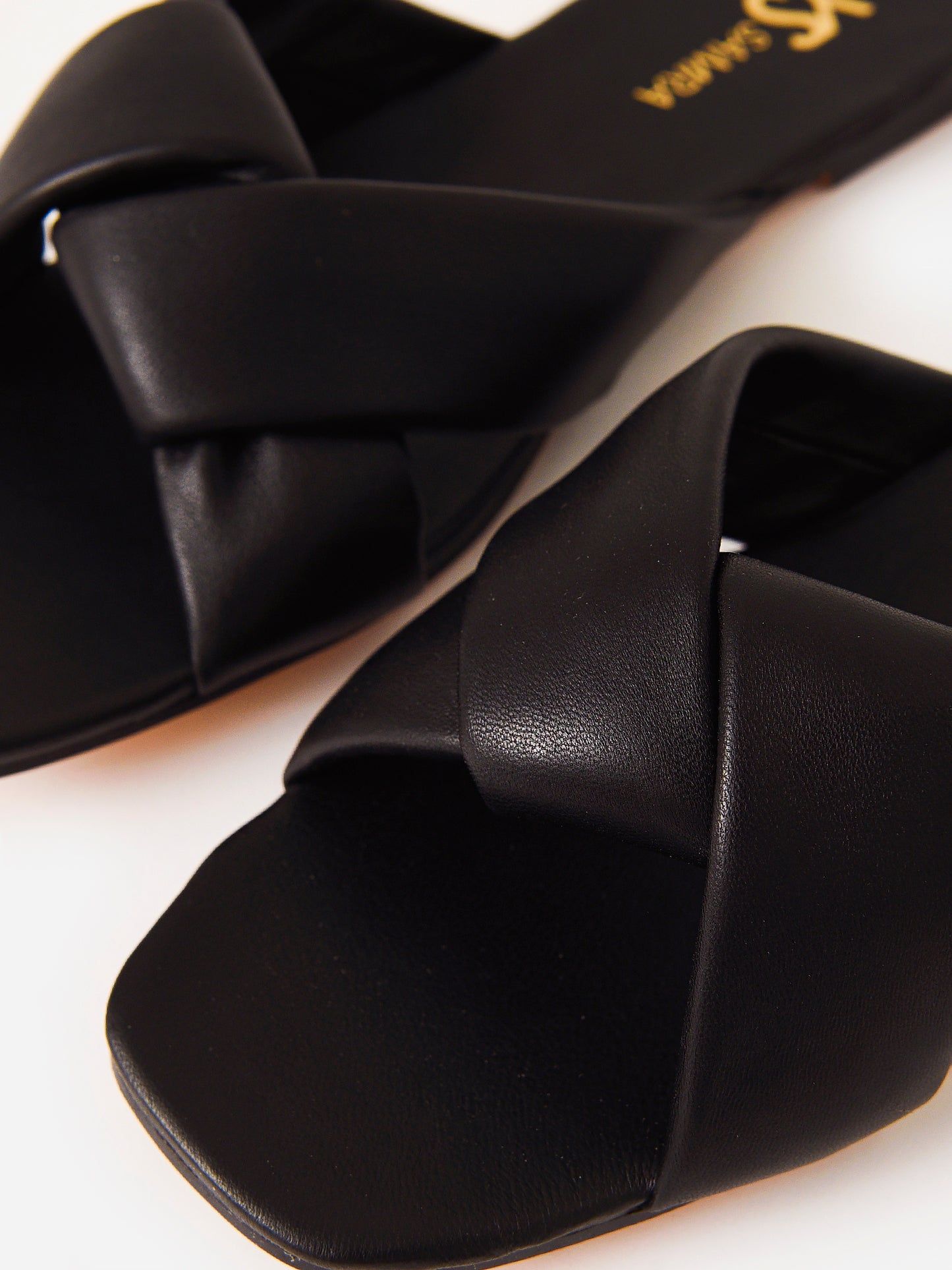 Slip-on sandal with delicate cross straps.
