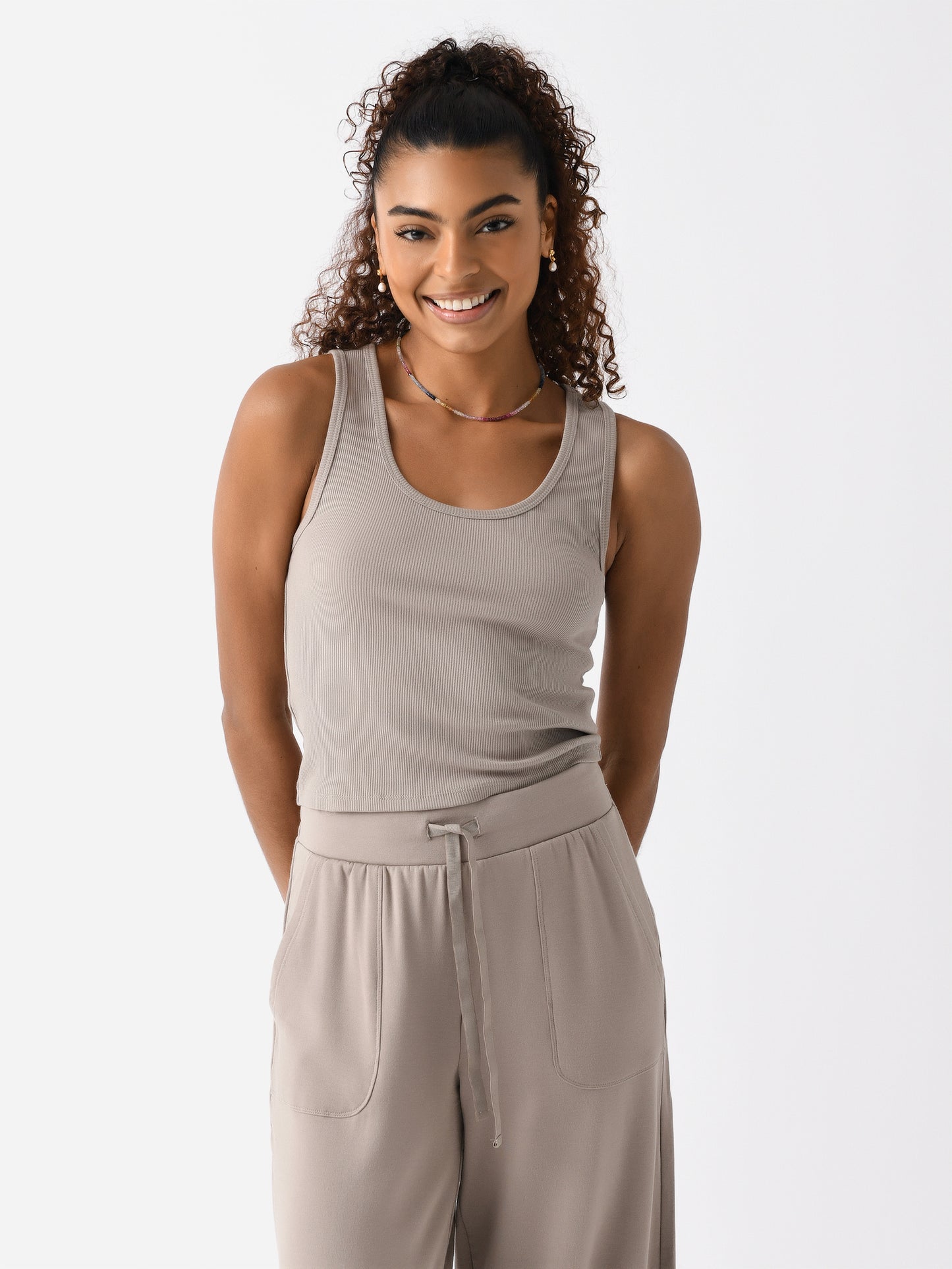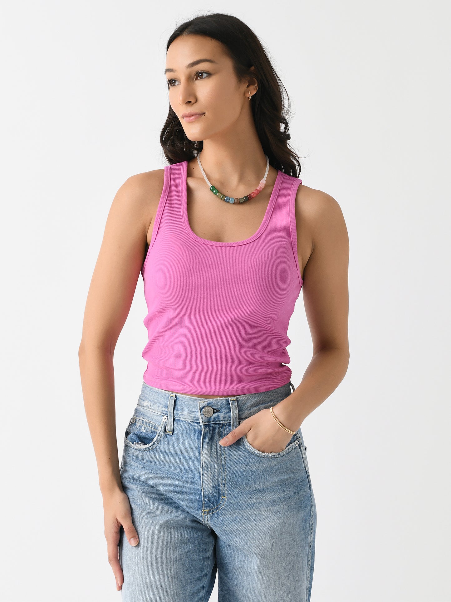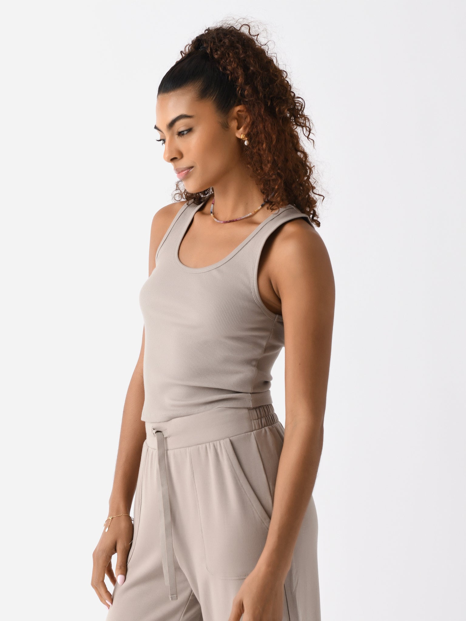 A slim-fitting ribbed tank top with bra-friendly straps.