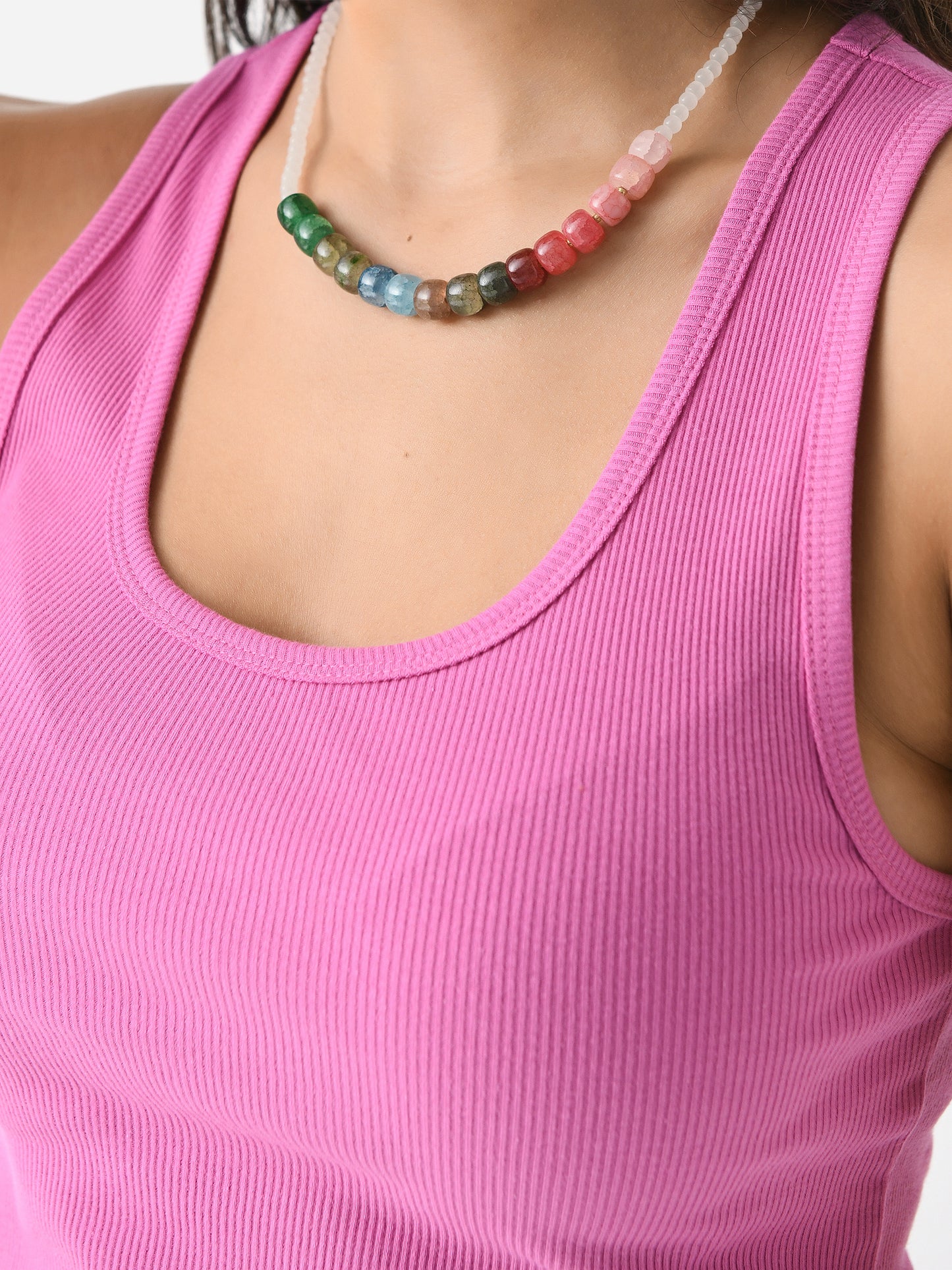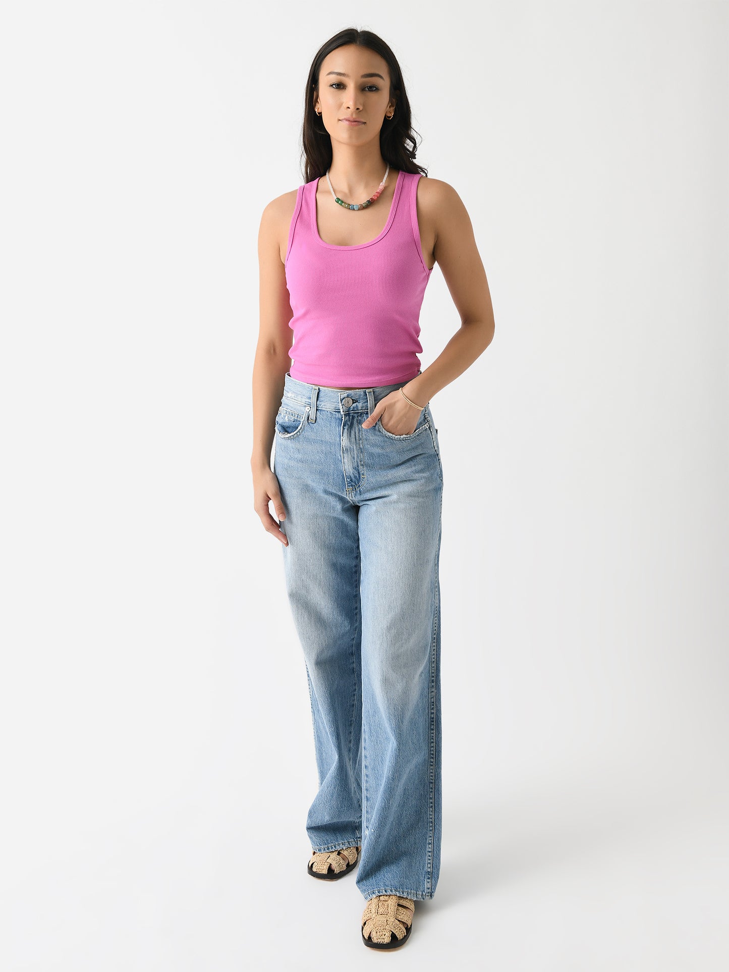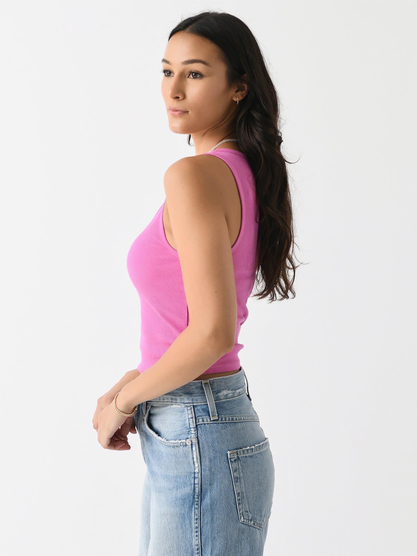 A slim-fitting ribbed tank top with bra-friendly straps.