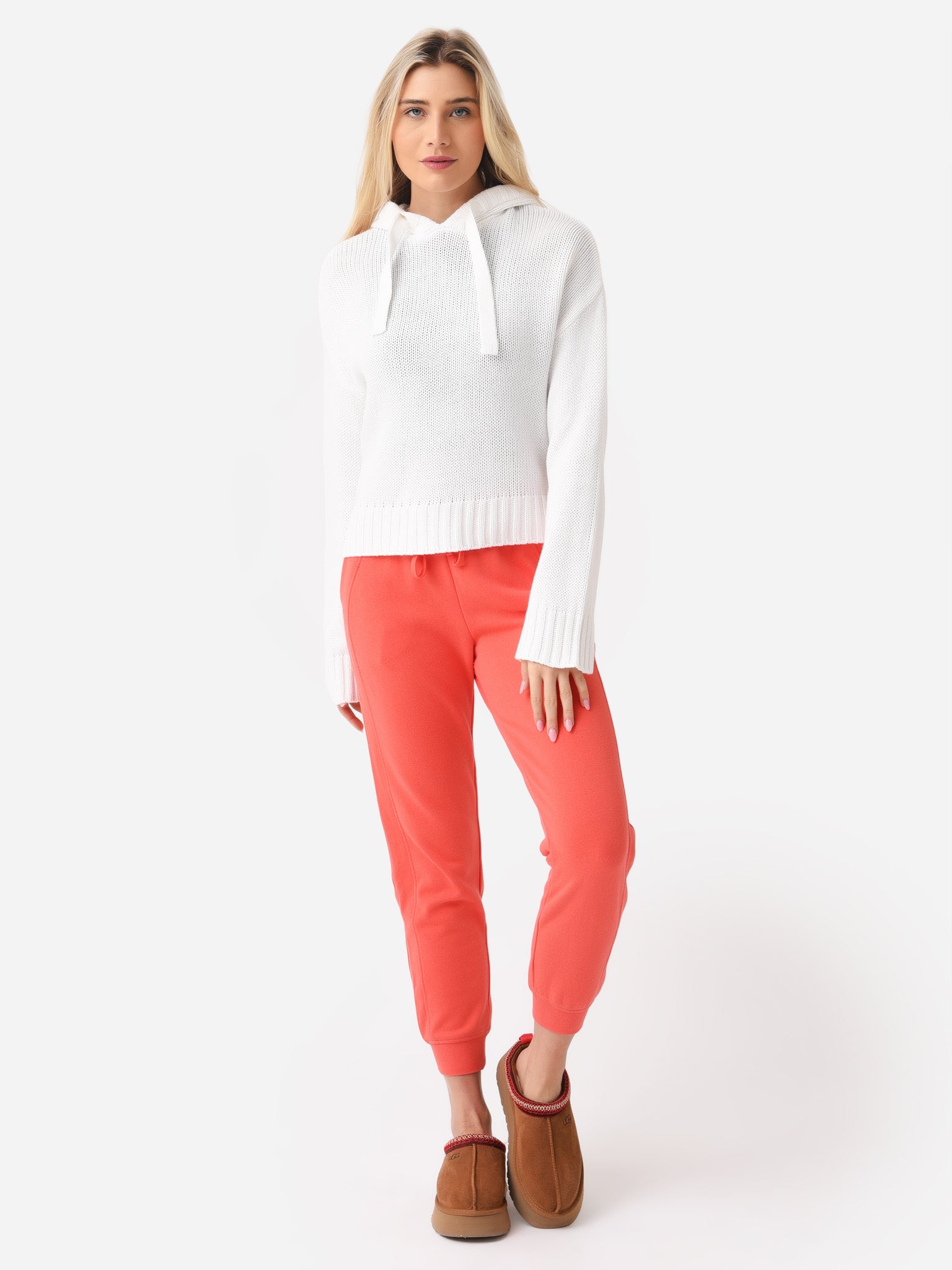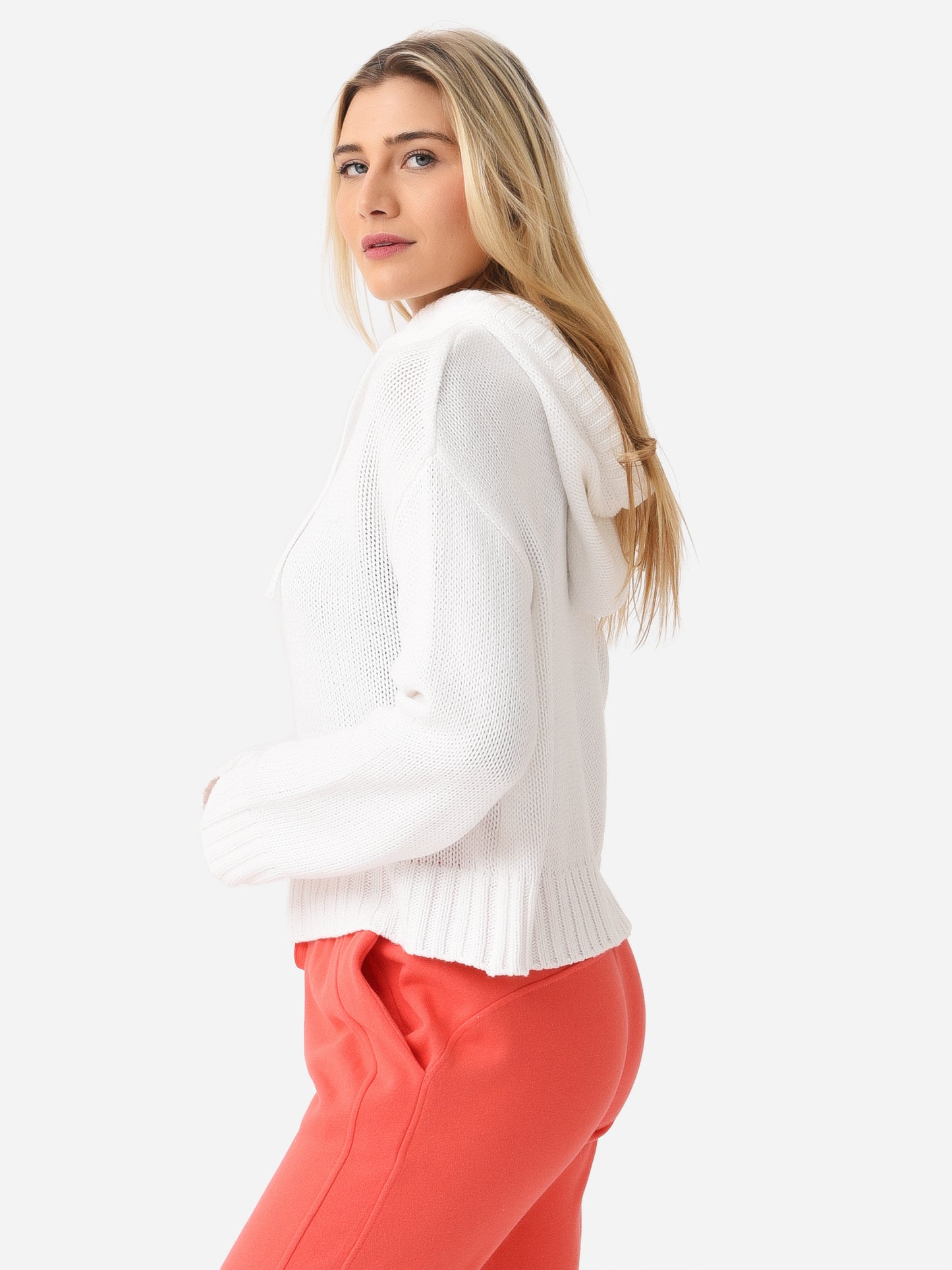 Knit pullover sweater with a thick drawcord hood.