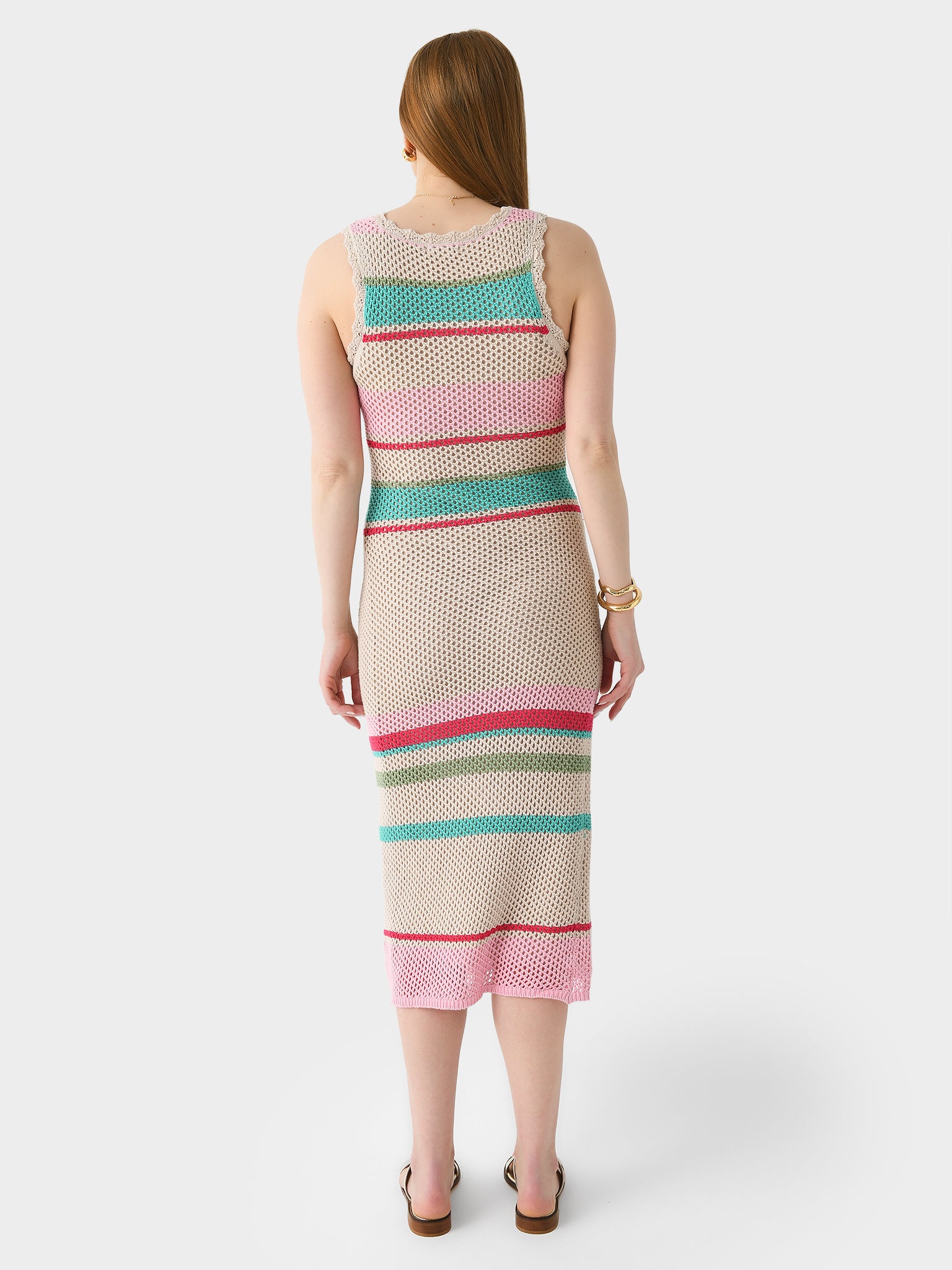 A lightweight knit dress with colorful stripes and a mid-length silhouette.