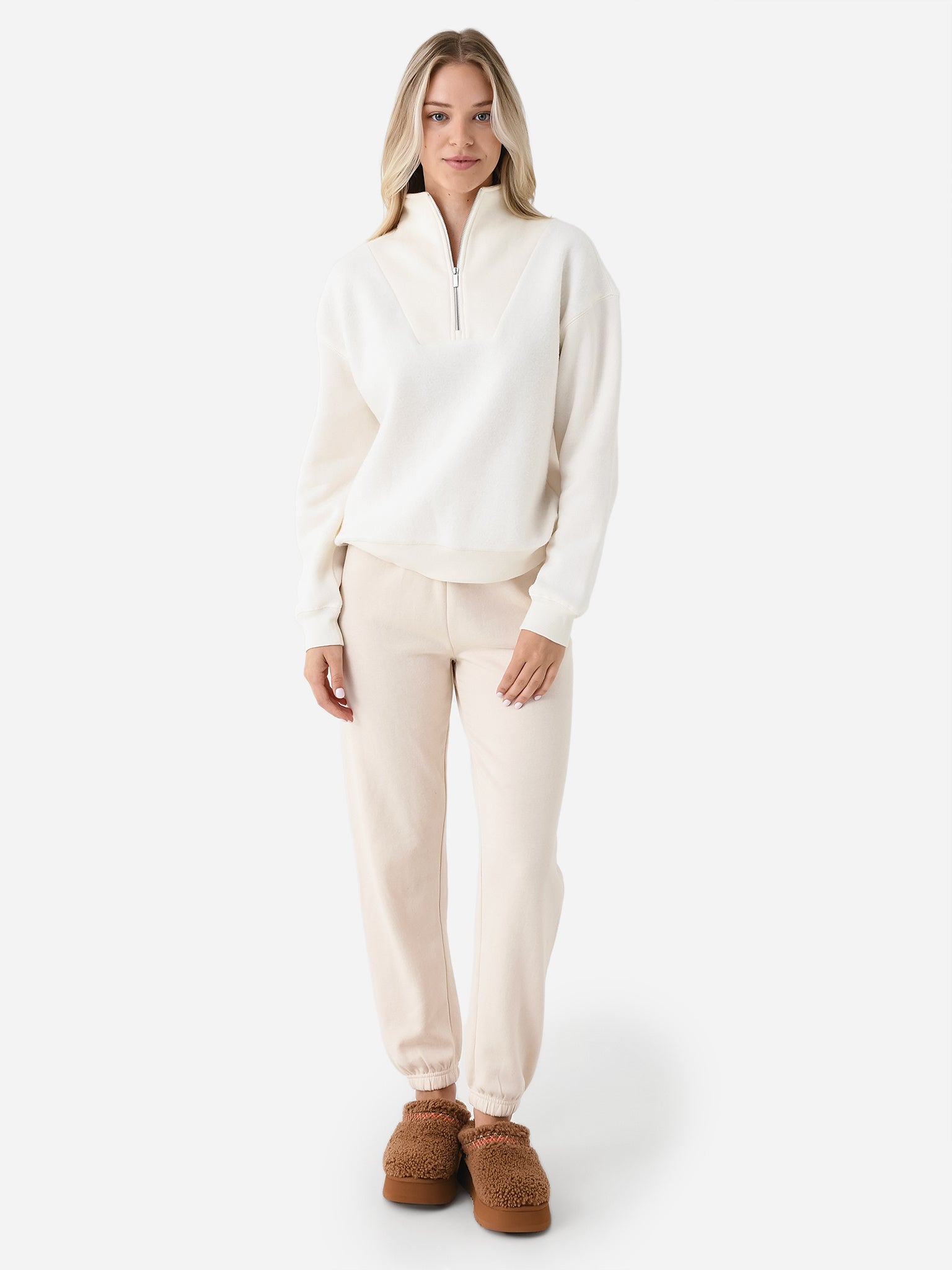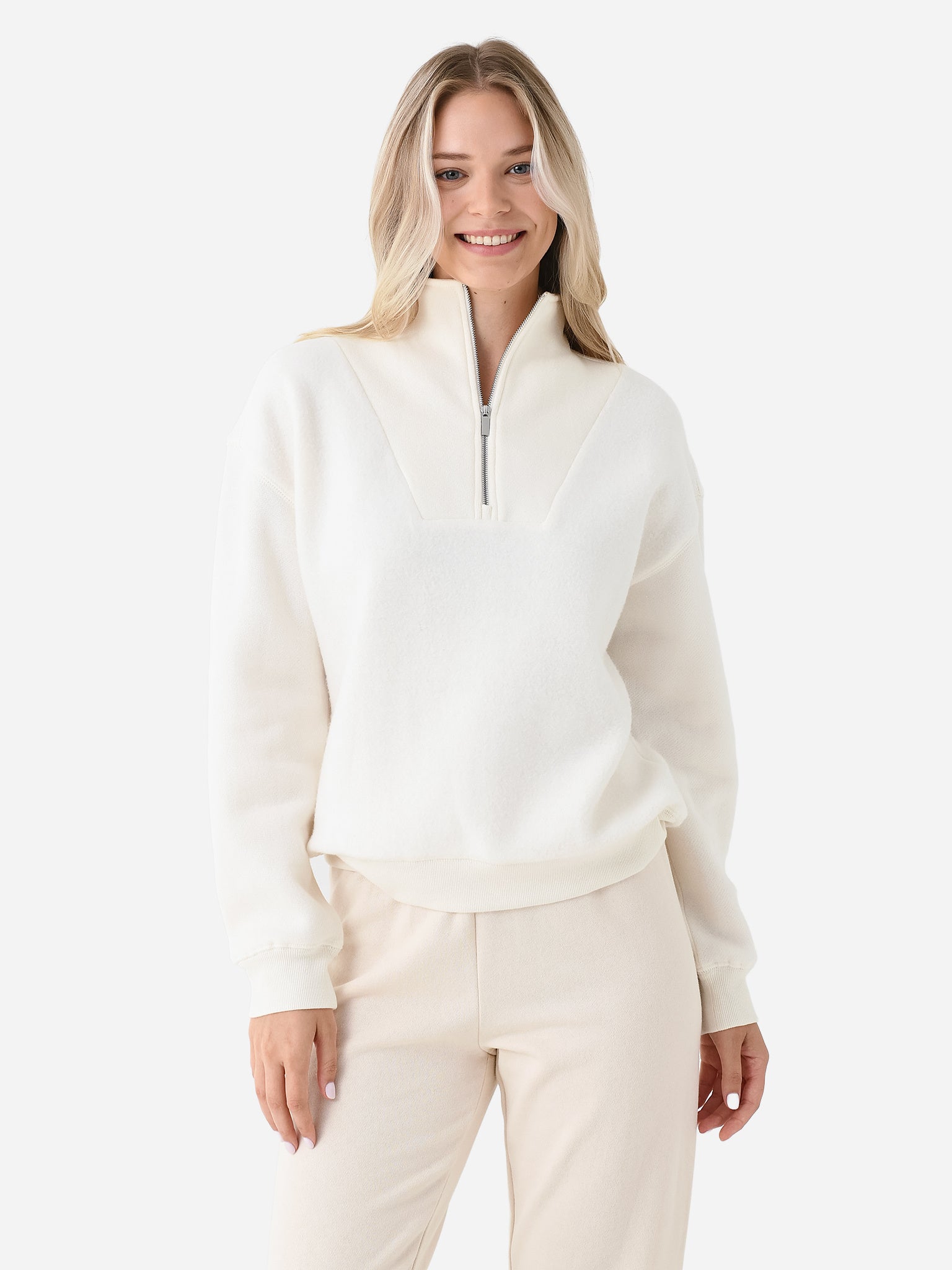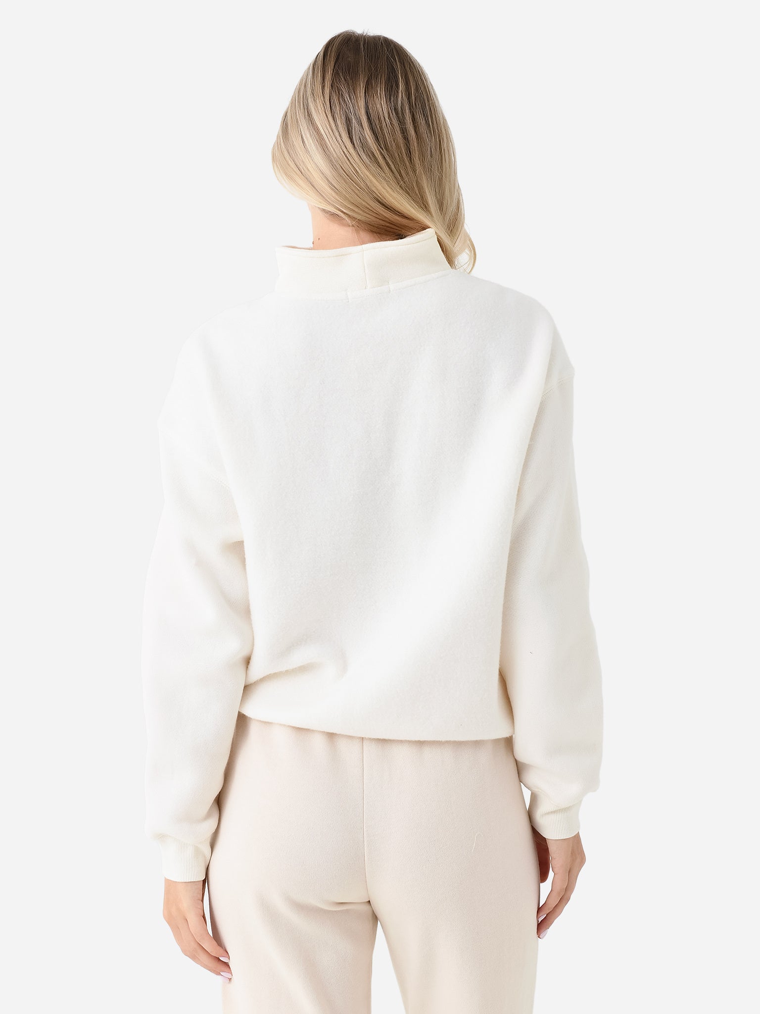 Quarter-zip sweatshirt featuring a cozy sherpa fleece body and dropped silhouette.