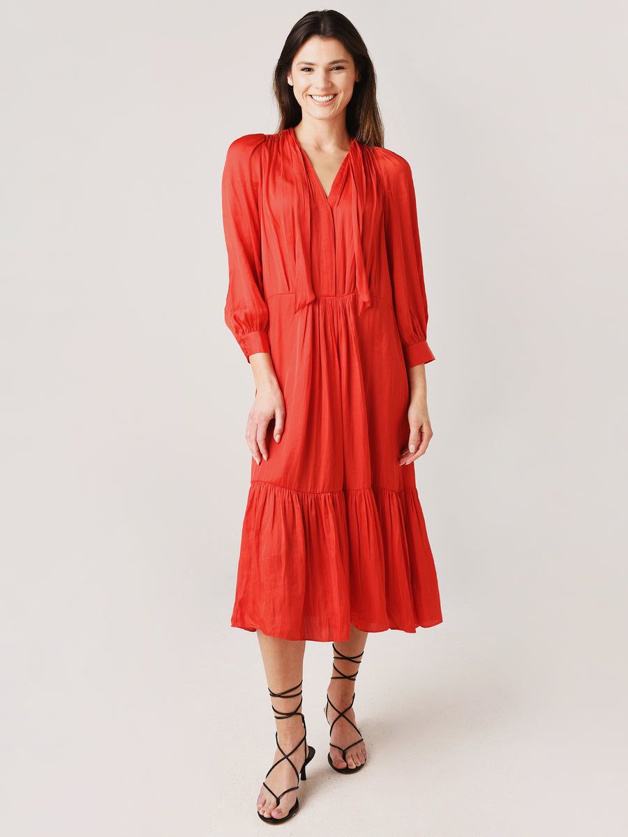 Midi Dress Split, V-Neckline Self Tie Detail at Neckline Long Puff Sleeve Tiered Styling Placket Button Closure Satin Fabrication Gathered Details Lightweight 100% Polyester Model is wearing size Small dress. Model's Measurements: Height: 5'9.5"; Bust: 34A; Waist: 26.5"; Hips: 37"; Dress Size: 2-4 (US)